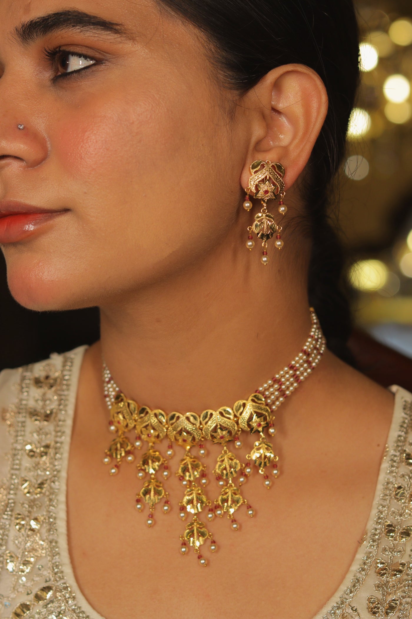 This exquisite Neha choker set blends traditional charm with refined artistry. The necklace features intricately carved gold motifs, each cascading into delicate dangling designs adorned with pearls and red bead detailing. The base is strung with multiple strands of tiny white and red beads, lending the piece a regal touch. Paired with matching drop earrings, this set is perfect for festive occasions, weddings, and celebrations - adding a graceful finish to any ethnic attire.