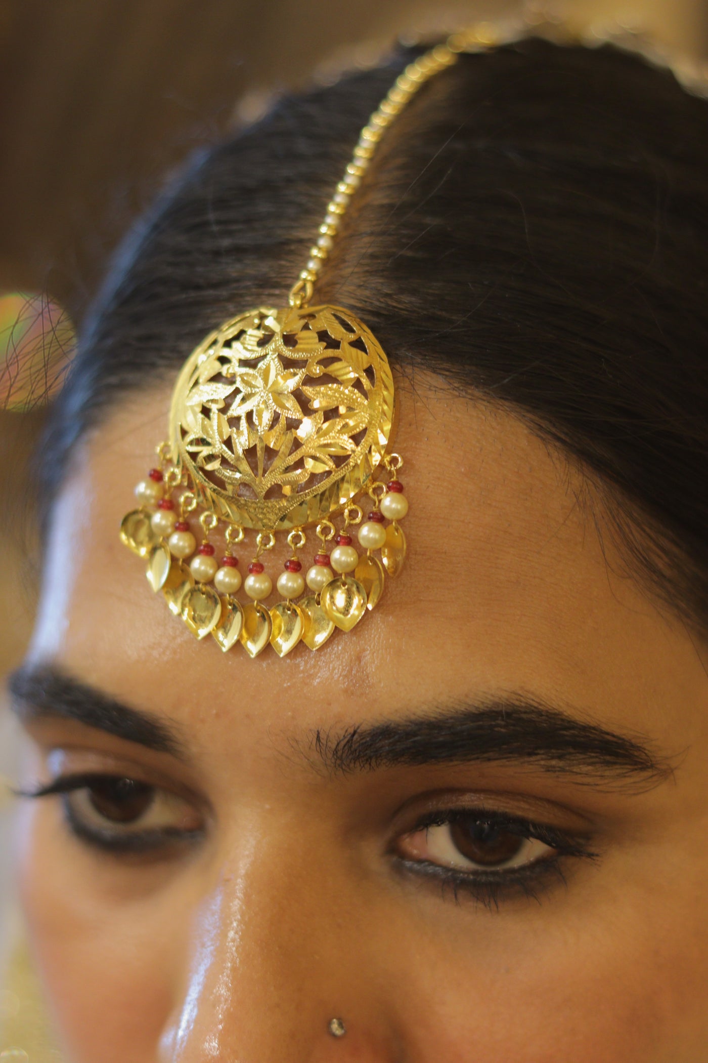 Gold Maang Tikka with Filigree & Pearl Accents