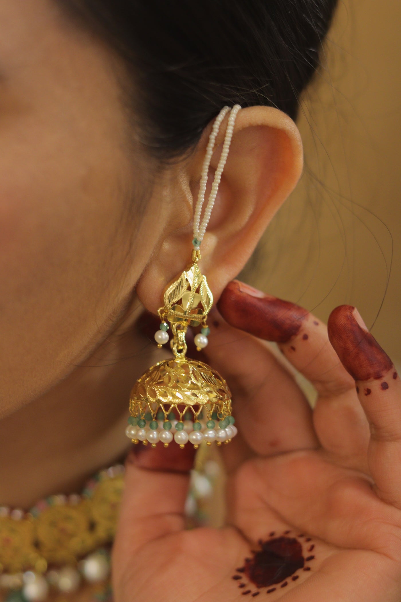 This traditional jhumka is crafted in radiant gold with intricate filigree work, exuding timeless charm. The dome-shaped design is adorned with delicate green beads and lustrous white pearls, creating a perfect balance of elegance and vibrancy. The earring features a lotus-inspired top and a classic chain attachment with tiny seed pearls, ensuring comfort and grace. Ideal for weddings, festive occasions, and cultural celebrations, this piece beautifully complements ethnic ensembles with its regal appeal.