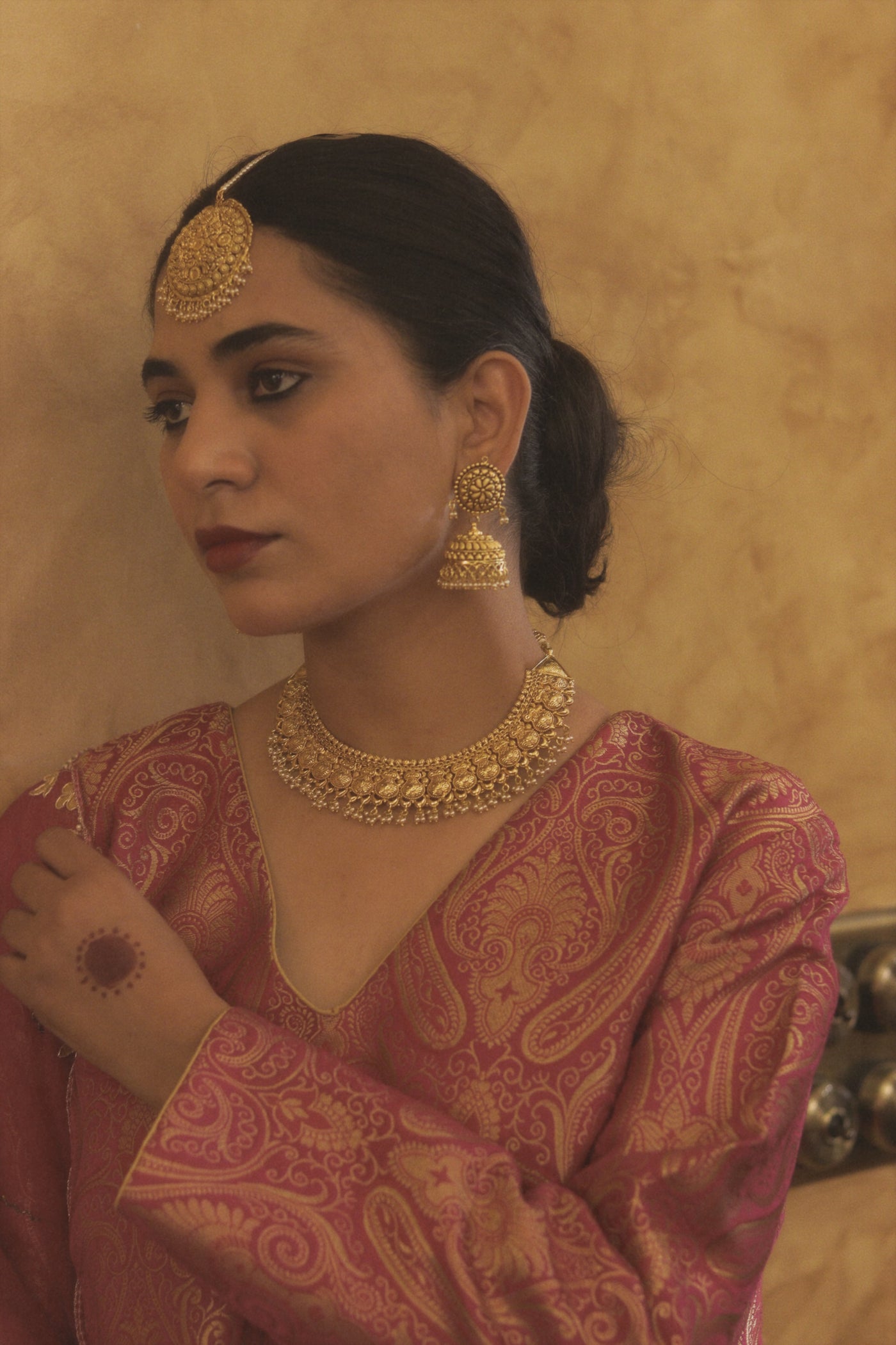 A perfect fusion of South Indian design and bridal opulence, the Moti Mahal Necklace Set is handcrafted in 92.5 silver with a 24-karat gold coating. The maang tikka commands attention with its intricate filigree and bead drops. Tiered jhumkas combine floral motifs with bell-shaped drops, echoing temple jewellery aesthetics. The choker-style necklace features Lakshmi motifs lined with neat gold beads, sitting snug on the collarbone, and pairing beautifully with traditional ensembles.