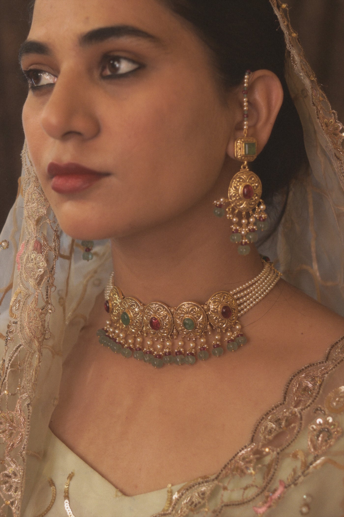 Handcrafted with 92.5 silver and coated in 24 karat gold, the Nihal Choker Set exudes regal charm. Five ornate gold medallions, engraved with floral motifs and embellished with red and green gemstones, form the choker’s base. Below, strings of white pearls and green jade beads with maroon accents add depth and richness. The earrings mirror the choker’s motifs, featuring emerald-green studs, red-centered floral designs, and beaded ear chains, making this set ideal for bridal or festive grandeur.