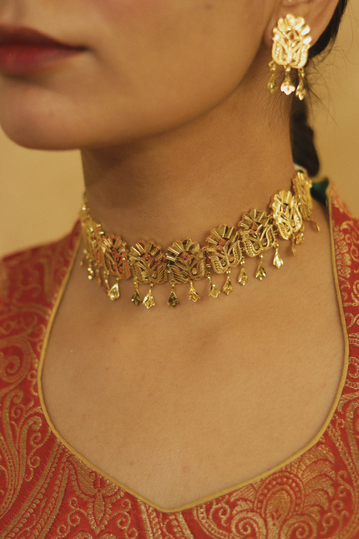 This piece is handcrafted in 92.5 silver and coated with 24 karat gold. If you wish to get it customized in gold, kindly drop us a message on whatsapp for a quotation.Any precious stones, if used, are lab tested and of...